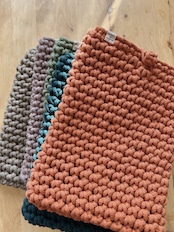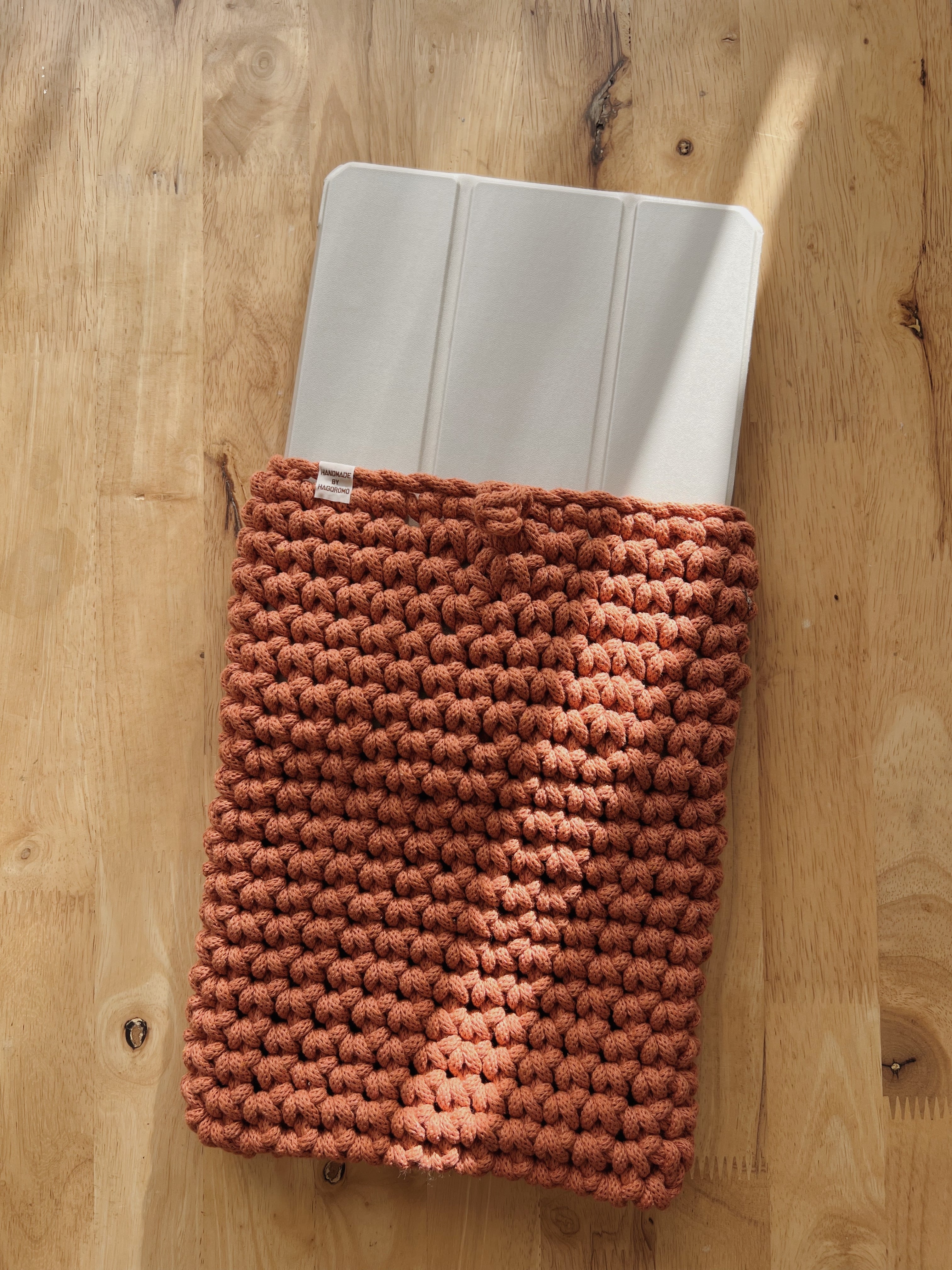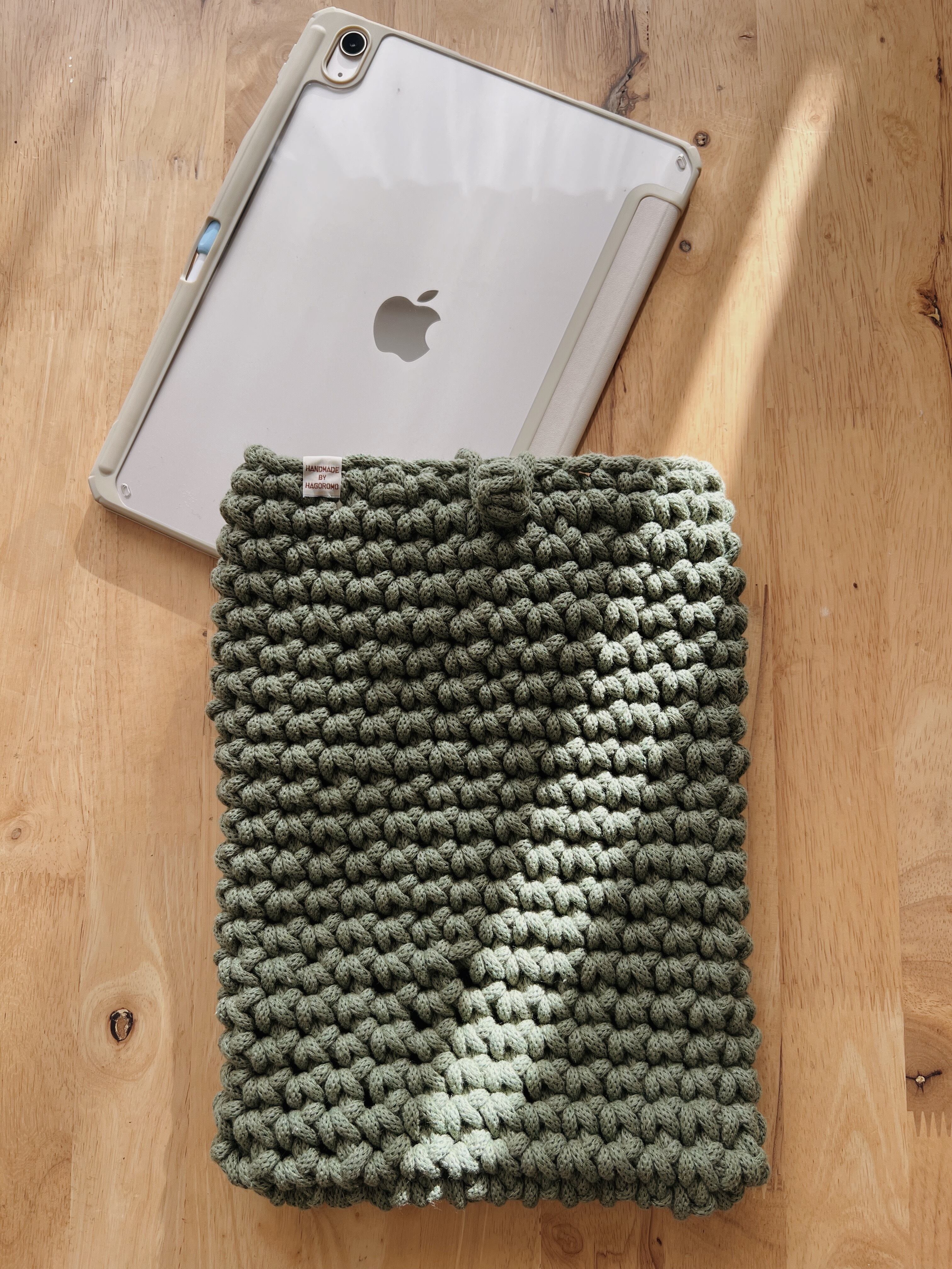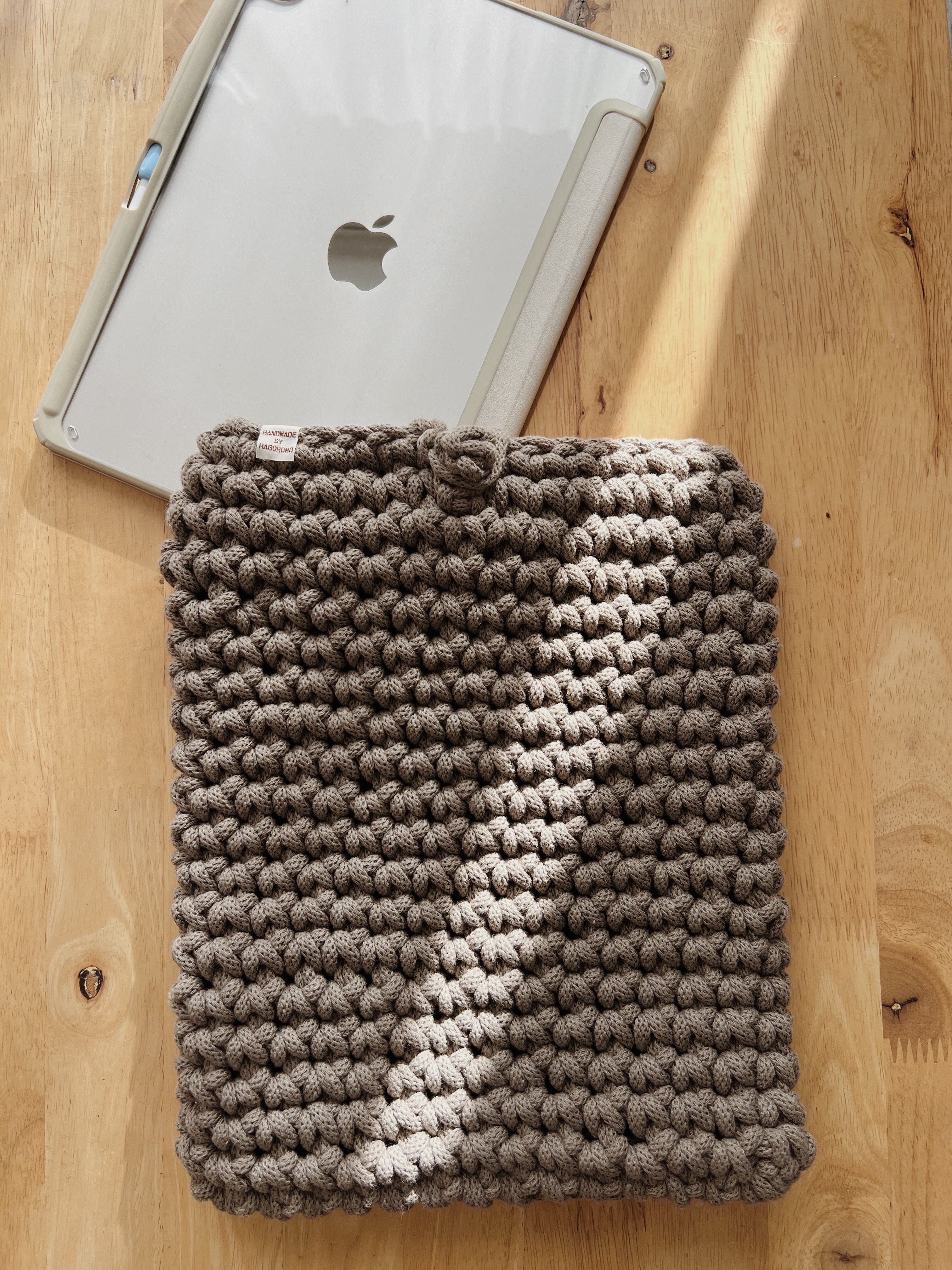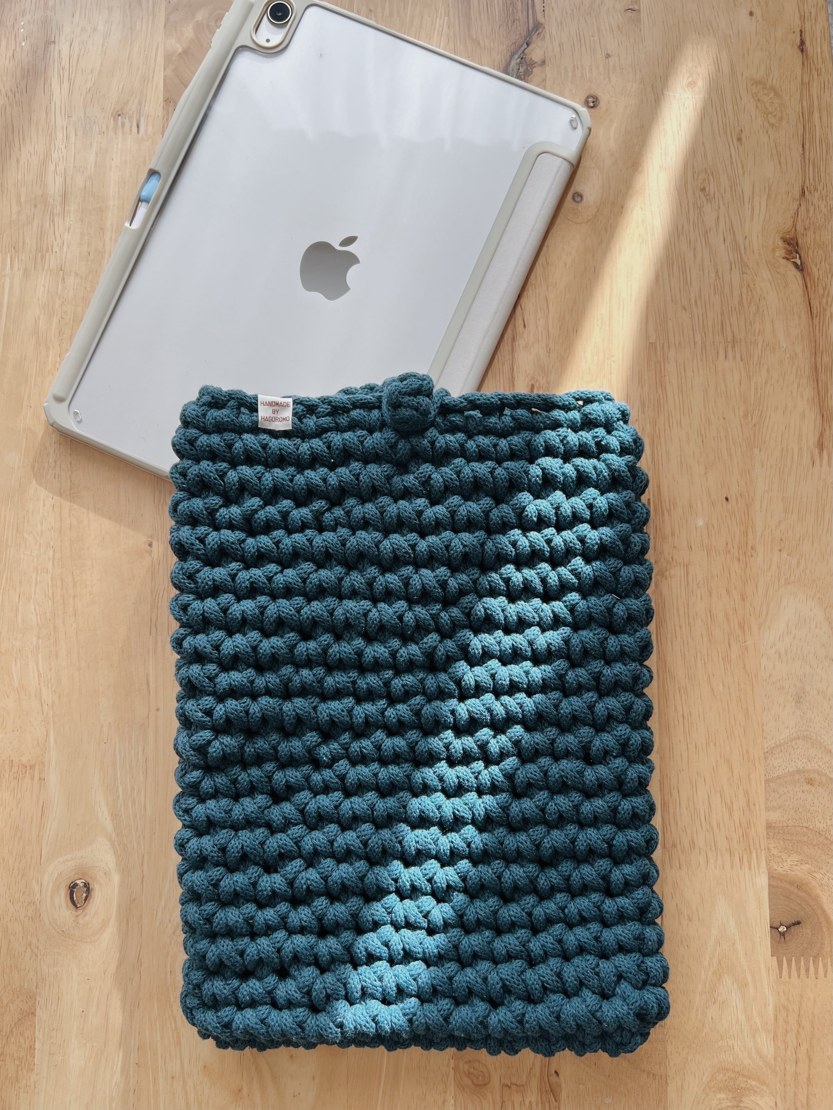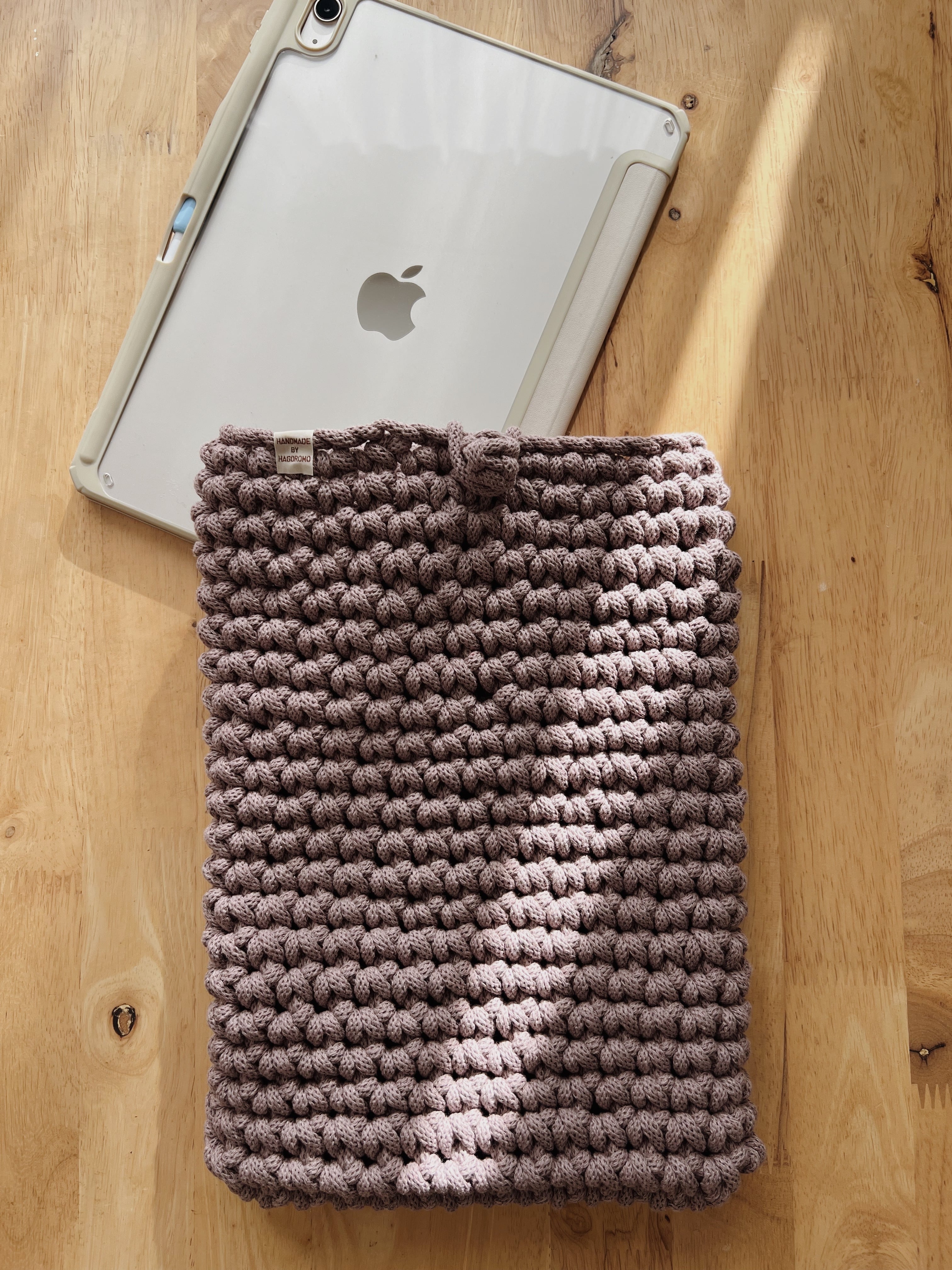 柔らかい触り心地でありながら、しっかりしたリサイクルコットンのマクラメコードを使用したiPad カバーです。