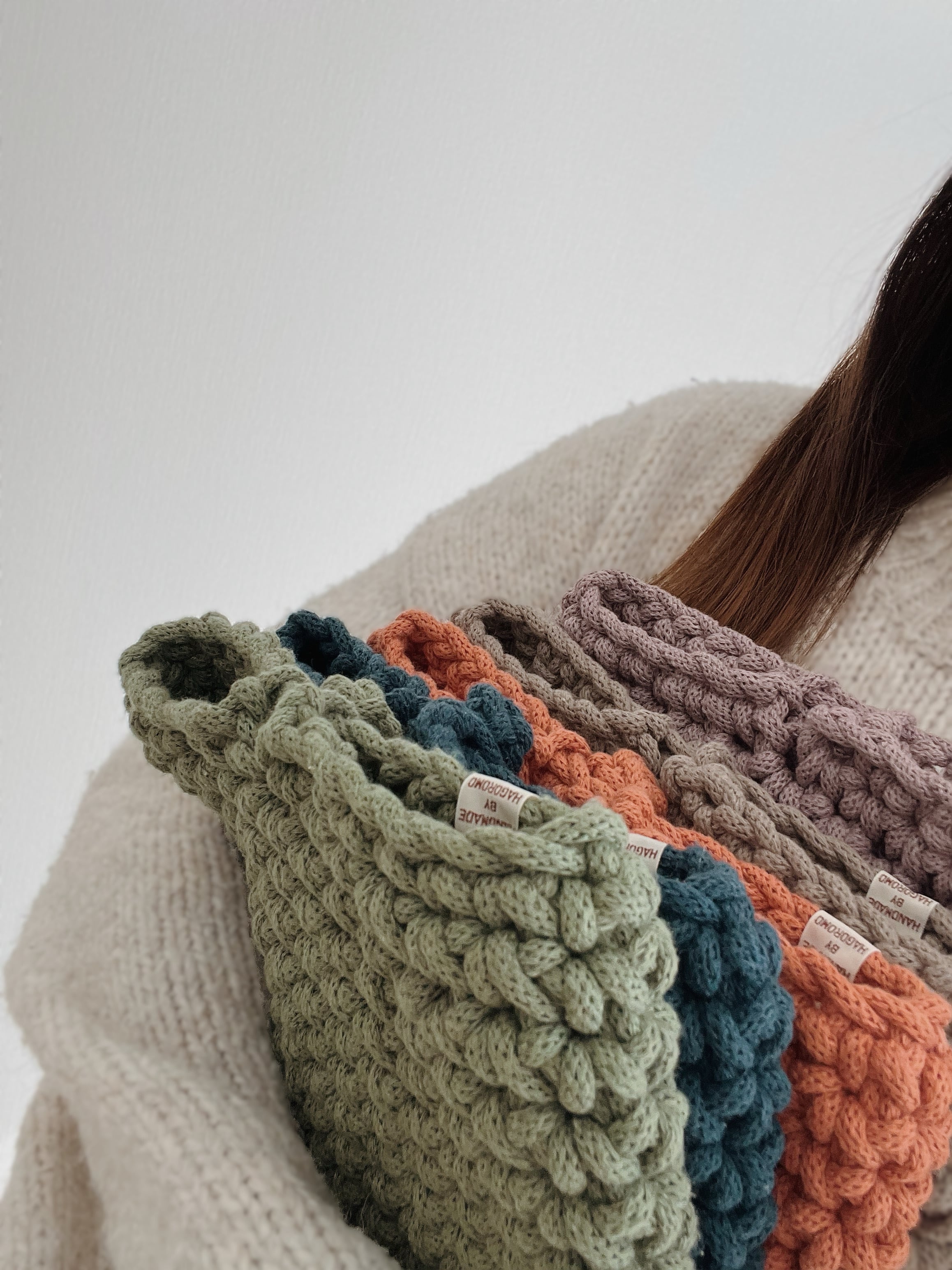 手に取るたびに感じる柔らかさと、丸みをおびたかわいらしい編み目が、いつでも持ち歩いて、眺めたくなるアイテムです。