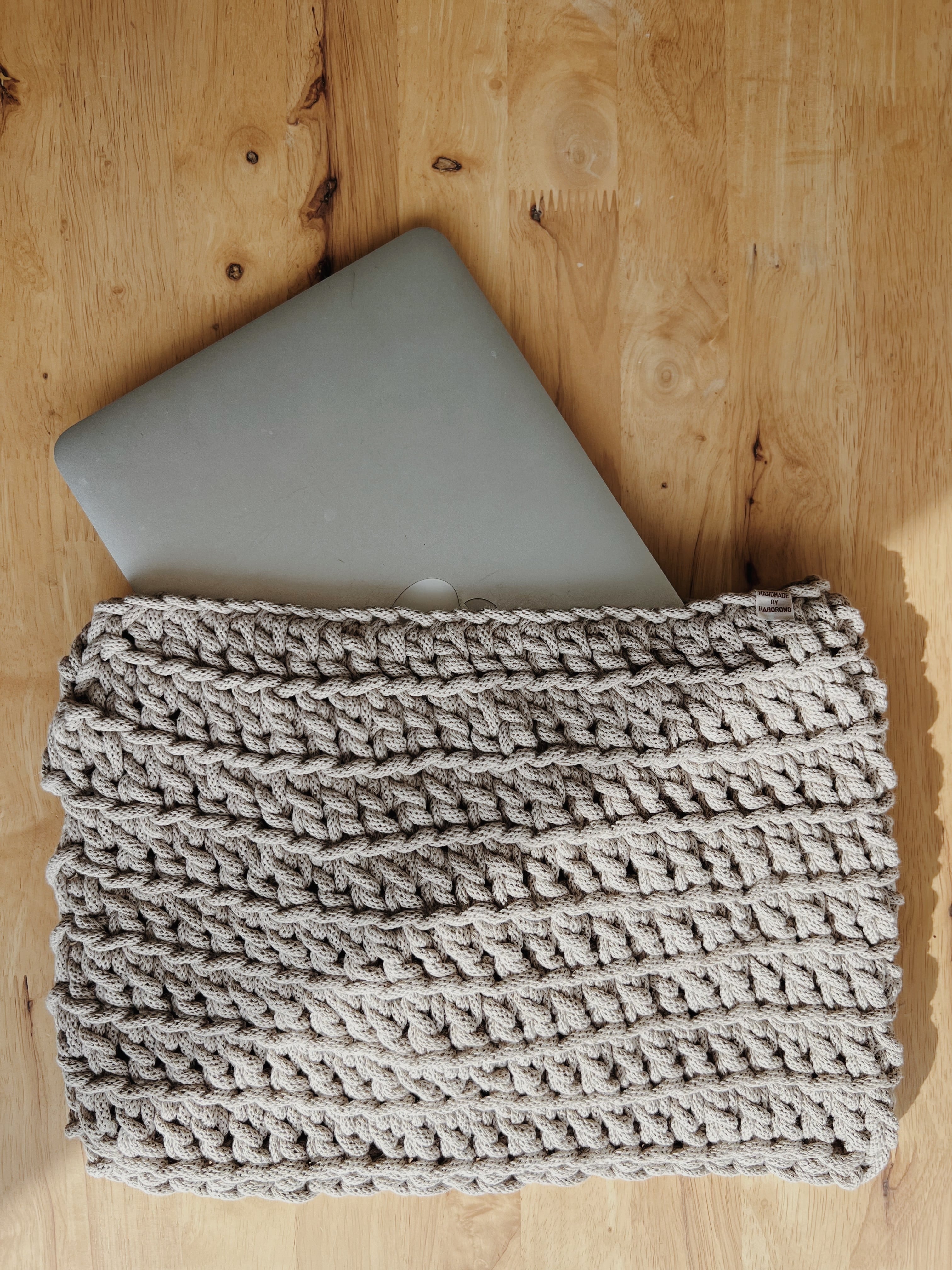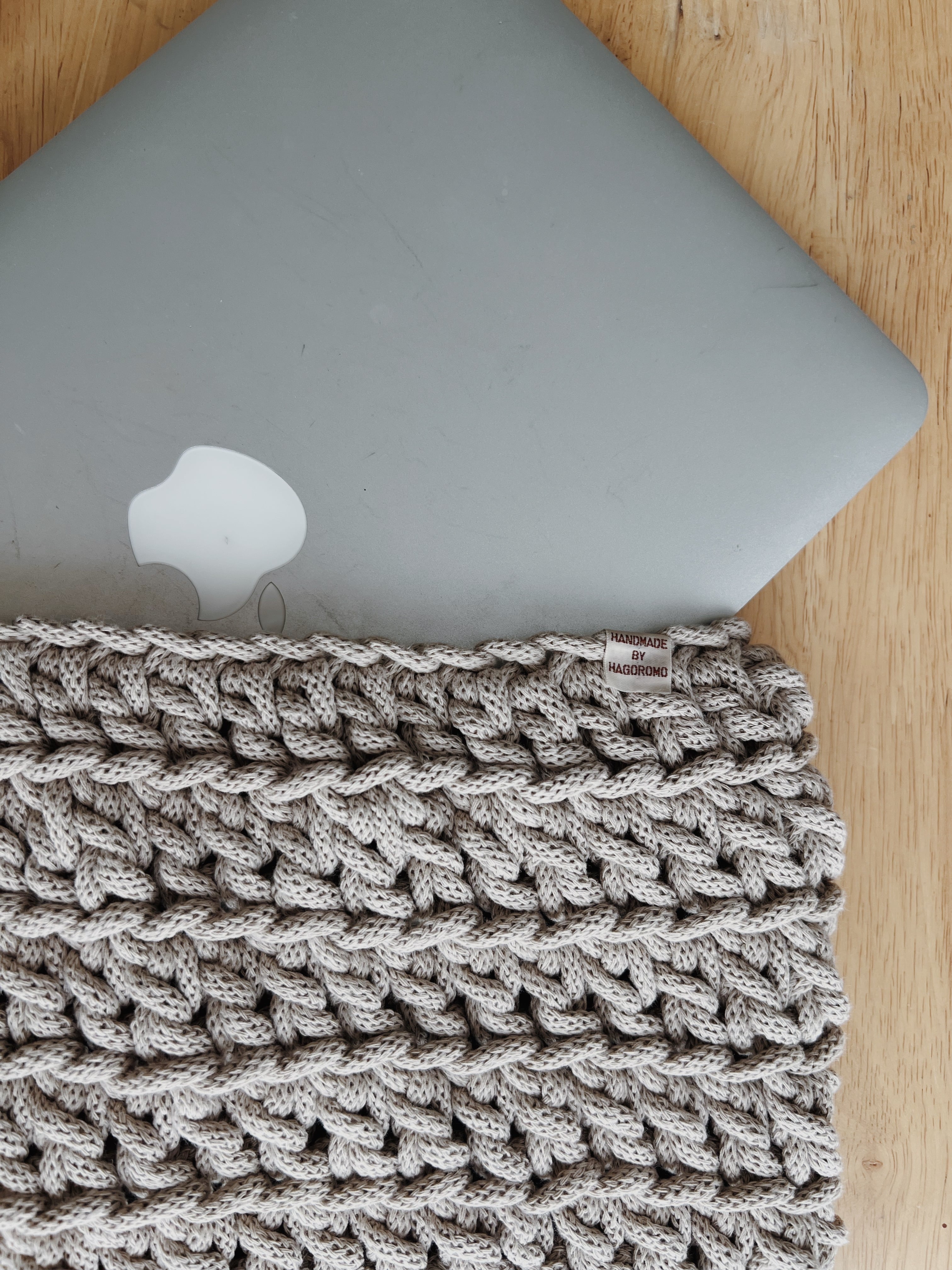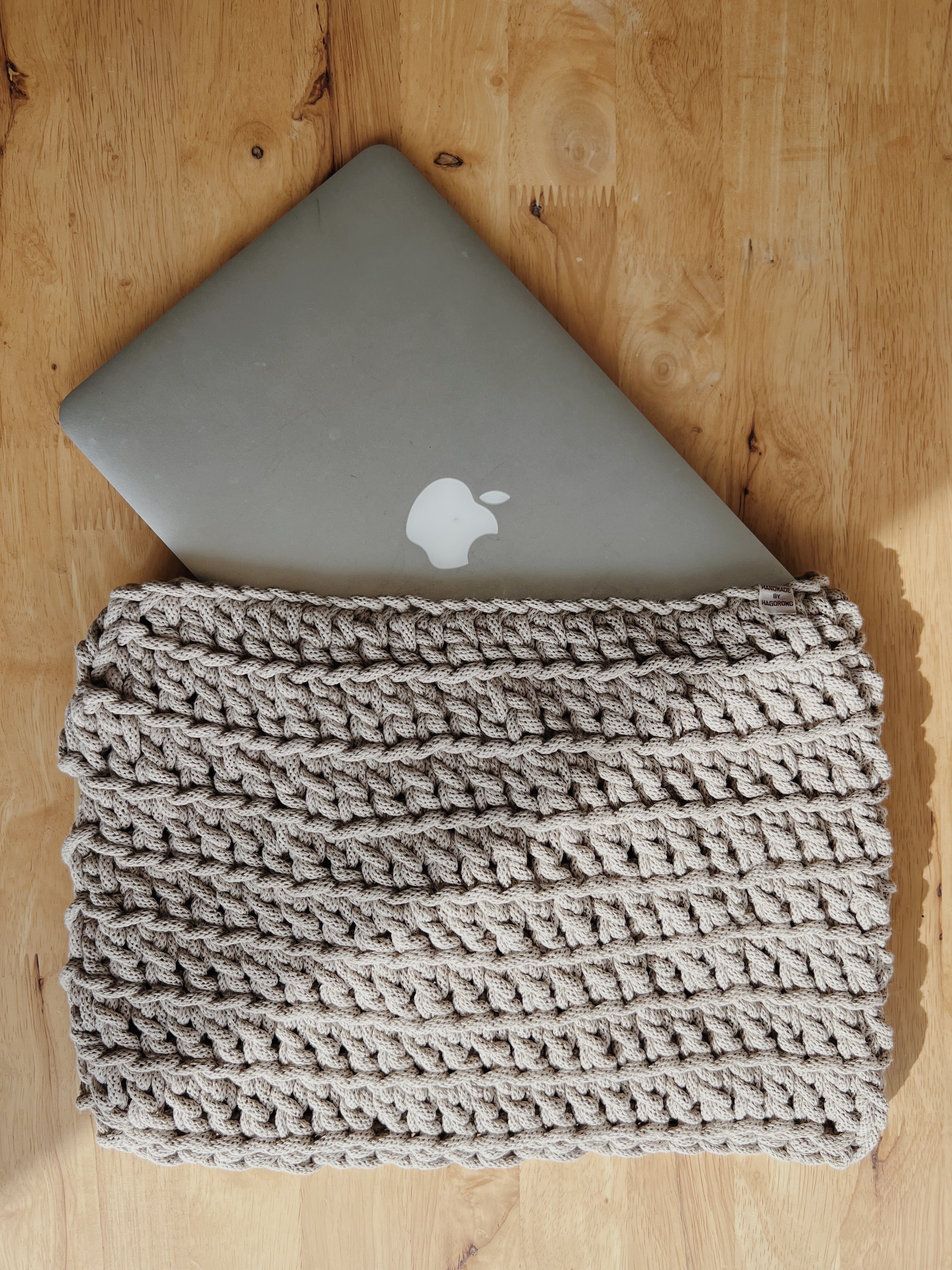 柔らかい触り心地でありながら、しっかりしたリサイクルコットンのマクラメコードを使用したLaptop Sleeve。