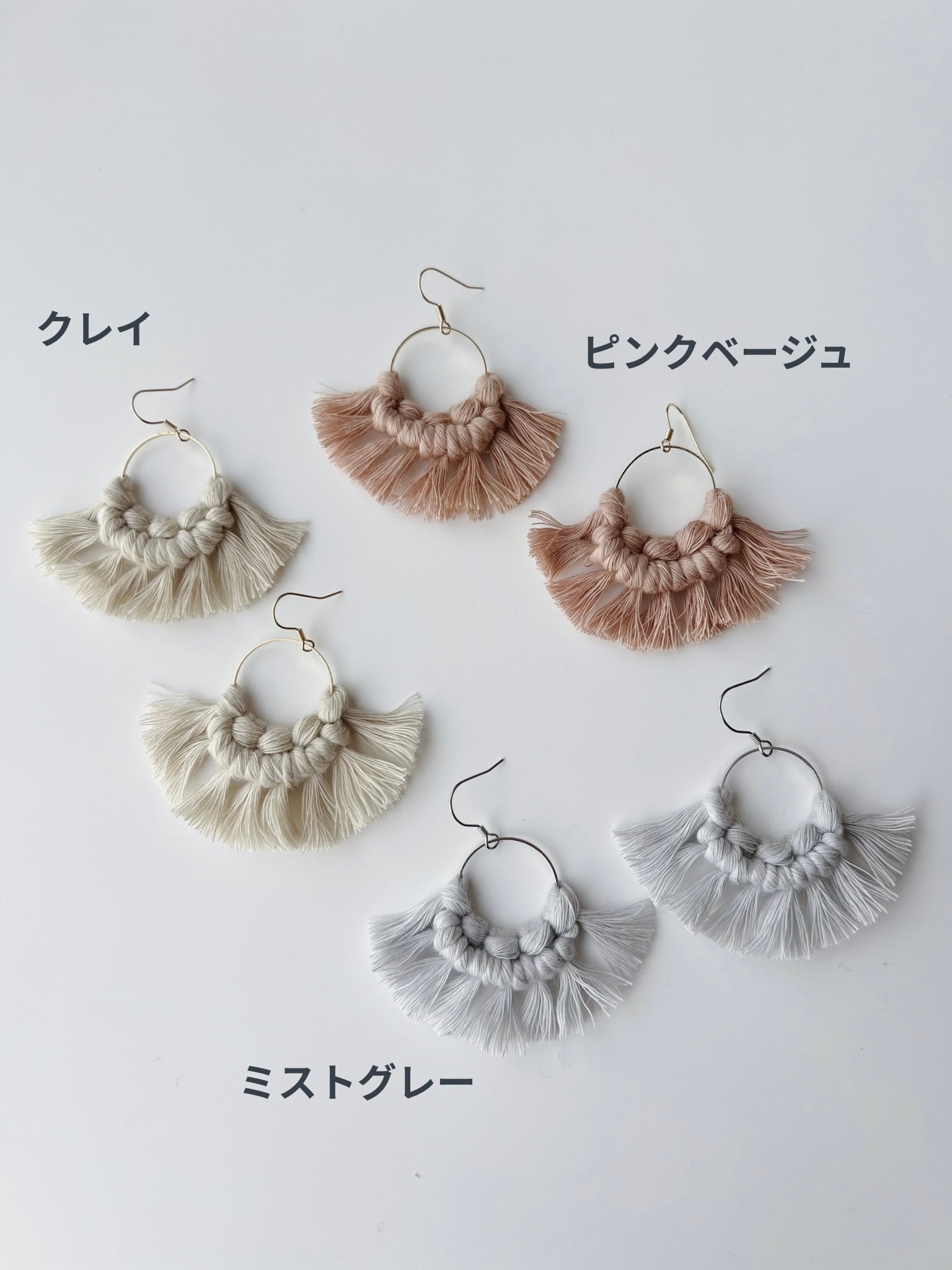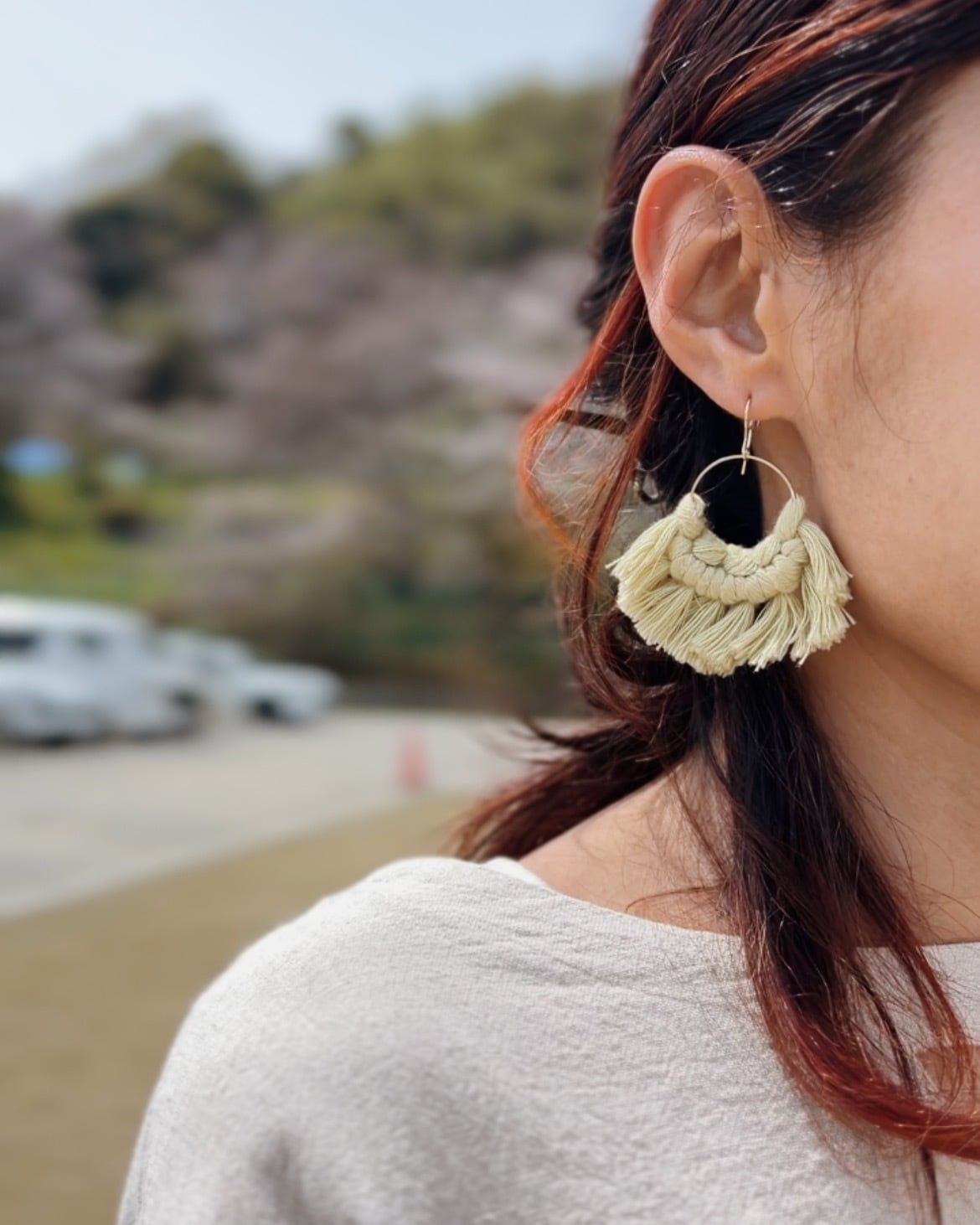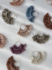 太めのマクラメ糸のぷっくり感と、フリンジのふさふさのバランスがかわいく耳元で揺れるピアスです。
